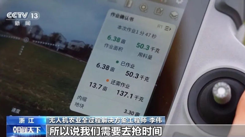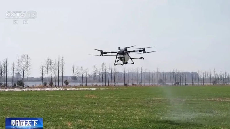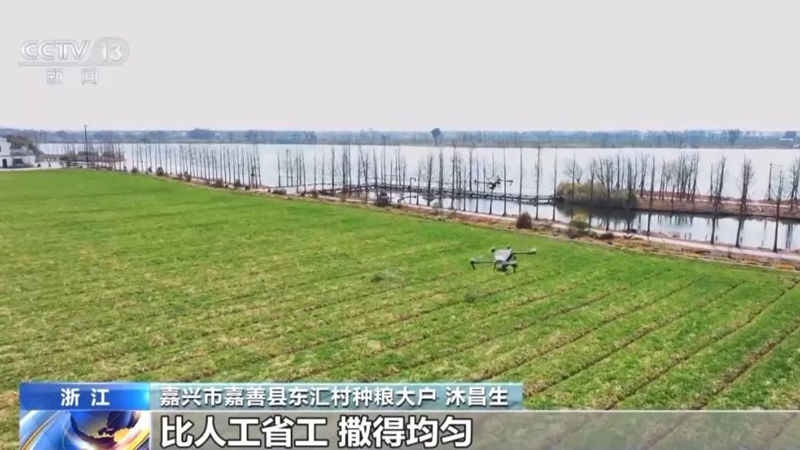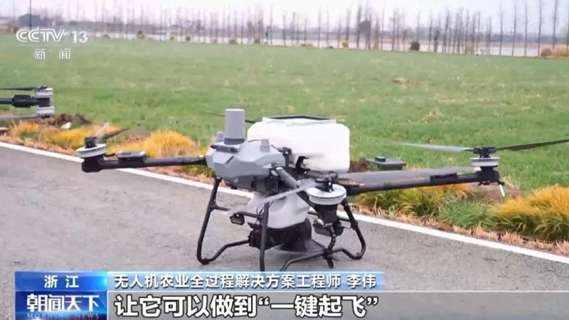總臺央視記者 蔣樹林:在浙北大糧倉——浙江省嘉興市的嘉善縣,這臺無人機(jī)是今年剛剛新出的最新的型號。