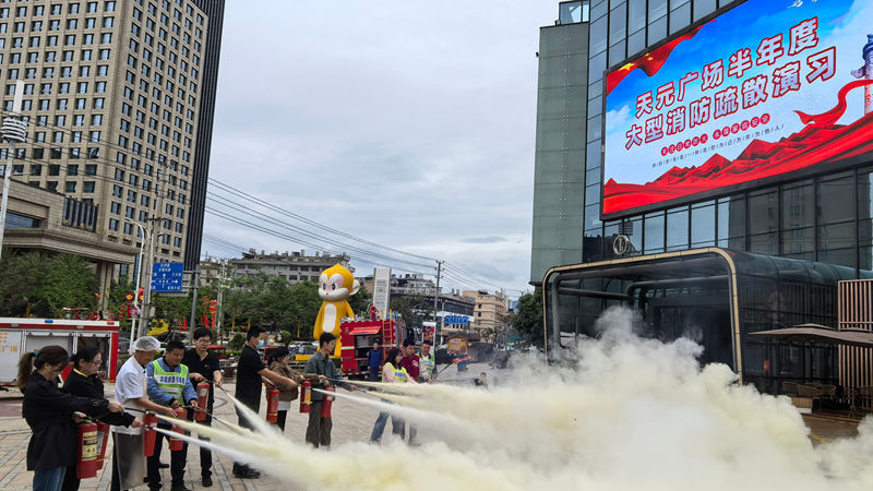 隨著消防警報響起,演練正式拉開帷幕。參演人員迅速進入應(yīng)急狀態(tài),按照預定疏散方案,用濕毛巾捂住口鼻,沿安全指示標識快速有序撤離。與此同時,接到警報的商場自有消防車第一時間出動,迅速抵達模擬起火點,熟練操作高壓水槍實施滅火作業(yè),整個過程緊張有序。