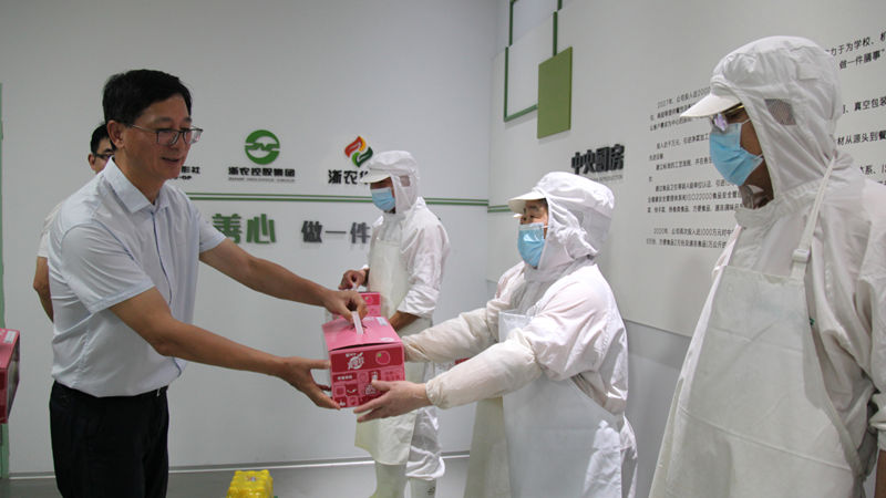 在浙農(nóng)華盛期間,曹勇奇還聽取了公司經(jīng)濟(jì)指標(biāo)、重點(diǎn)項(xiàng)目和重點(diǎn)工作完成情況匯報(bào),并深入配送場地、中央廚房以及相關(guān)部門,看望慰問奮戰(zhàn)在高溫一線的干部職工,為他們送上防暑降溫用品。
